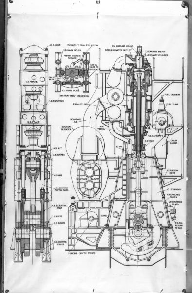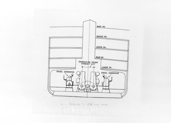 - Photograph, Harland and Wolff. Subject : DRAWING: CROSS SECTION OF SHIP SHOWING POSITION OF DIESEL ENGINES.