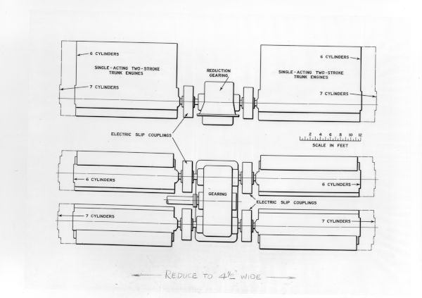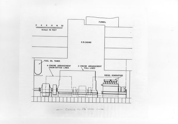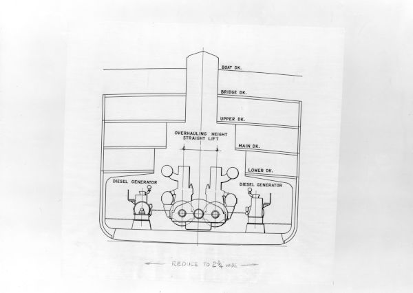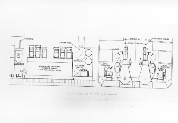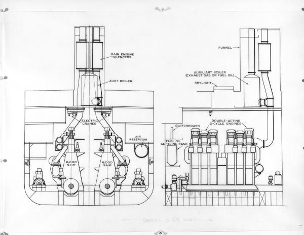 - Photograph, Harland and Wolff. Subject : DRAWING: CROSS SECTION OF SHIP SHOWING POSITION OF DIESEL ENGINES.