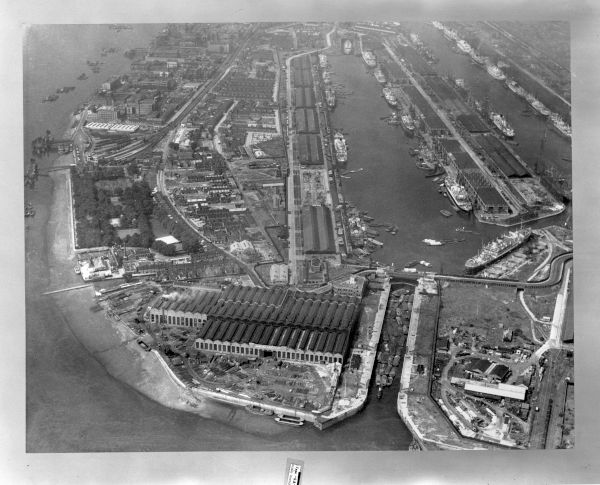 - Photograph, Harland and Wolff. Subject : AERIAL PHOTOGRAPH OF NORTH WOOLWICH WORKS, LONDON (copy of 5389).