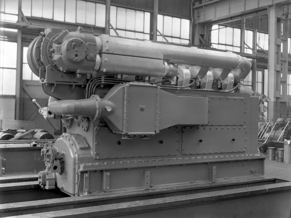 - Photograph, Harland and Wolff. Subject : 6cyl 250/300 PRESSURE CHARGED ENGINE - BUCHI BLOWER. Engine No. : 2529.