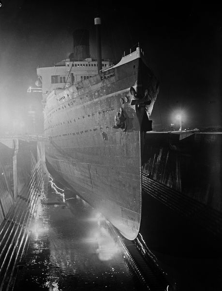 - Photograph, Harland and Wolff. Subject : STARBOARD BOW VIEW OF VESSEL IN GRAVING DOCK. Name : MAJESTIC ex Bismark.