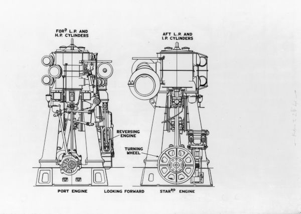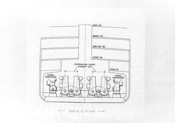 - Photograph, Harland and Wolff. Subject : DRAWING: CROSS SECTION OF SHIP SHOWING POSITION OF DIESEL ENGINES.