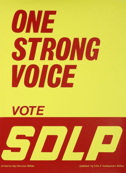 - Poster printed red on day-glo yellow. Issued by the SDLP (Social Democratic Labour Party) for the Northern Ireland Westminster Election February 1974. 'One Strong Voice, Vote SDLP.' In the election the SDLP put forward nine candidates and received 22.0% of the vote. Party leader Gerry Fitt retained the West Belfast seat but was the only successful candidate.