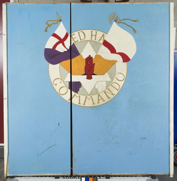 Emblem of the Red Hand Commando with the Ulster Volunteer Force Purple Standard and Ulster Banner flags.