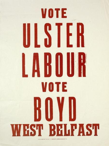 - Poster issued by the NILP, Northern Ireland Labour Party and dates from the time of the UK General Election in 1964. In West Belfast the NILP candidate William Boyd received 12,571 votes but finished third behind the Ulster Unionist James Kilfedder and Harry Diamond of Republican Labour. Printed red on white.