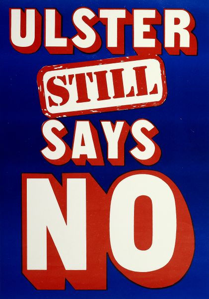 - Poster issued by the Grand Orange Lodge of Ireland, 'Ulster Still Says No.' Printed with white and red text on a dark blue background. This poster was produced in late 1986 at the time of the first anniversary of the Anglo-Irish Agreement. An anti-Agreement rally by unionists at Belfast City Hall was again attended by approximately 200,000 people but unlike the previous year was followed by violence and two nights of rioting in loyalist areas across Northern Ireland.