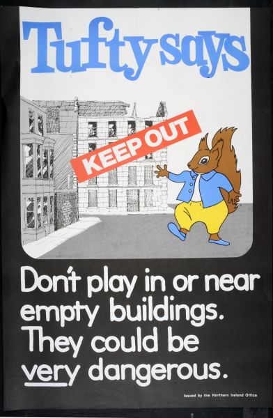 - This Northern Ireland Office poster is aimed at keeping children away from derelict buildings. The poster uses the cartoon figure of Tufty the squirrel which was used in road safety campaigns to warn that unused buildings could be dangerous. 'Don't play in or near empty buildings. They could be very dangerous.'