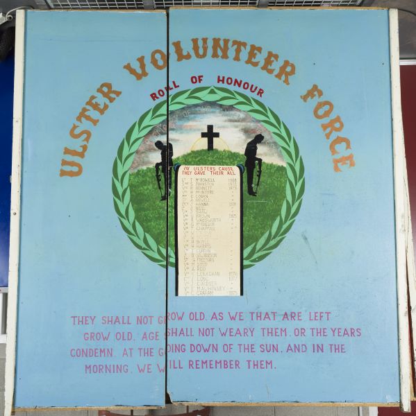 It depicts an Ulster Volunteer Force (UVF) roll of honour. Below is a passage from Laurence Binyon's poem 'For the Fallen'.