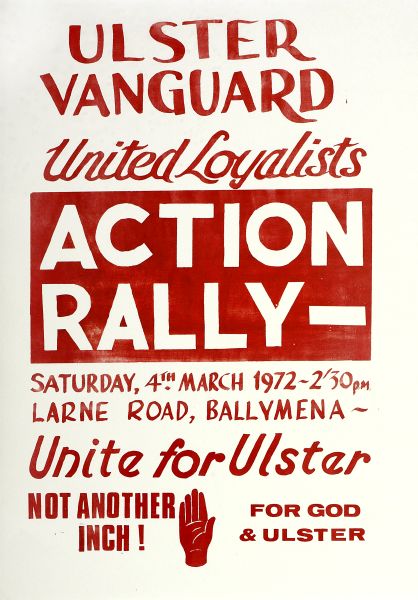 - Printed red on white Ulster Vanguard, 'United Loyalists Action Rally, 4th March 1972 at Ballymena.' Ulster Vanguard, led by William Craig, was launched on 9 February 1972 only weeks before the introduction of Direct Rule. Vanguard organised a series of rallies across Northern Ireland in February and March 1972.