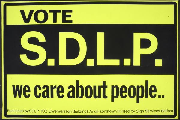 - Poster issued by the SDLP (Social Democratic Labour Party), Larkfield Branch. Produced in May 1973, screen-printed black on yellow dayglo background. 'Vote SDLP, We care about people.' Formed in August 1970 the SDLP quickly became the party supported by most nationalist voters in Northern Ireland and would remain so for the next three decades.