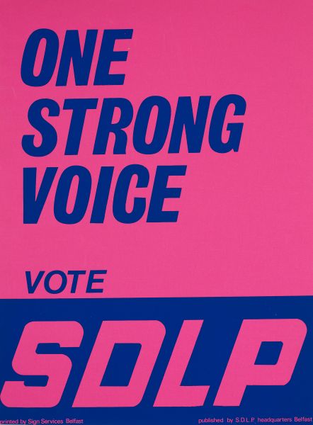 - Poster printed blue on day-glo pink. Issued by the SDLP (Social Democratic Labour Party) for the Northern Ireland Westminster Election February 1974. 'One Strong Voice, Vote SDLP.' In the election the SDLP put forward nine candidates and received 22.0% of the vote. Party leader Gerry Fitt retained the West Belfast seat but was the only successful candidate.