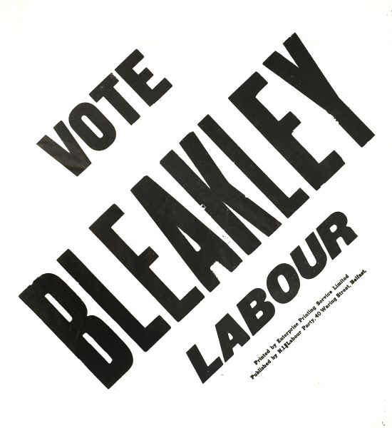 - Poster issued and published by the Northern Ireland Labour Party. Printed black on white with Vote Bleakley Labour placed diagonally across rectangle. This poster was produced by the NILP for the 1970 UK General Election. David Bleakley stood in the East Belfast constituency and received 18,259 votes but was defeated by the Ulster Unionist Stanley McMaster.