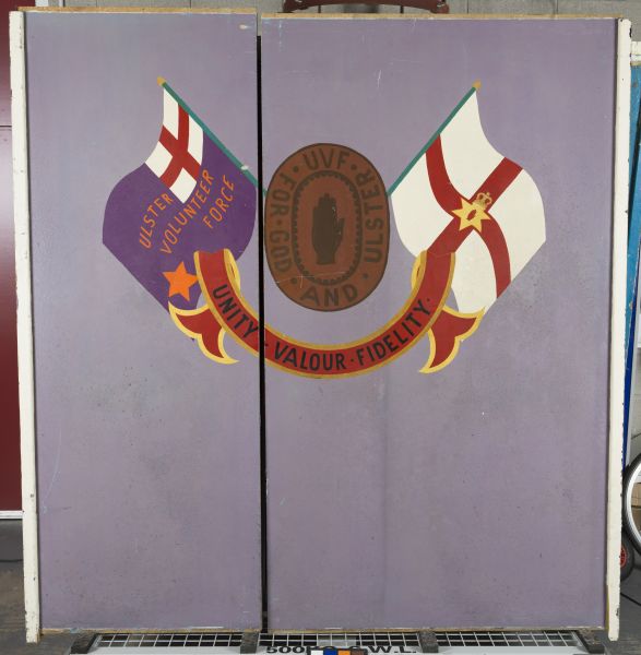 Ulster Volunteer Force (UVF) emblem surrounded by the Purple Standard flag and Ulster Banner flag, with a banner reading, 'Unity Valour Fidelity.'