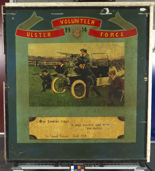 Depicts members of the Ulster Volunteer Force (UVF) in 1914 with a quote underneath attributed to Edward Carson.