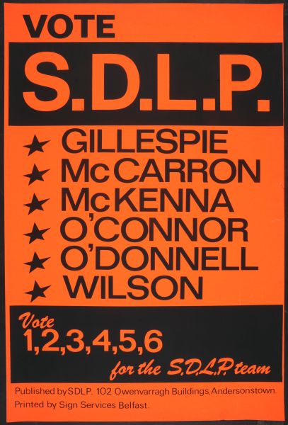 - Northern Ireland Local Government Elections 30th May 1973, SDLP Belfast Area D. Highlighting candidates; Gillespie, McCarron, mckenna, O'Connor, O'Donnell, Wilson. Screen-printed black on red dayglo background. In Belfast area D the SDLP ran six candidates of whom four; Gillespie, O’Donnell, Wilson and McCarron, were elected.