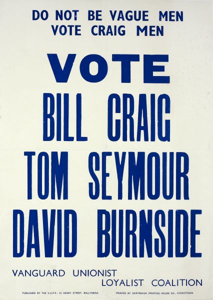 - Poster issued by the Vanguard Unionist Party for the June 1973 Northern Ireland Assembly election. 'Do not be vague men - vote Bill Craig. Vanguard Unionist Loyalist Coalition, Vote Bill Craig, Tom Seymour, David Burnside.' Of the three Vanguard leaders standing in North Antrim only party leader Bill Craig was elected. Printed blue on white.