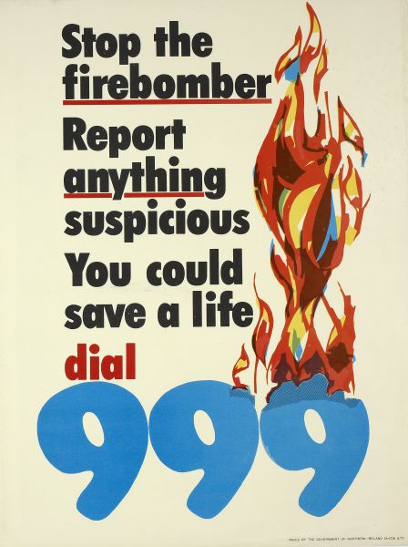 - Official Government of Northern Ireland poster produced in 1971. The poster draws attention to the use of incendiary devices which caused significant damage during the course of the Troubles. 'Stop the firebomber, Report anything suspicious. You could save a life, Dial 999.' Printed blue, orange/red and black on white with flames extending from the 999.