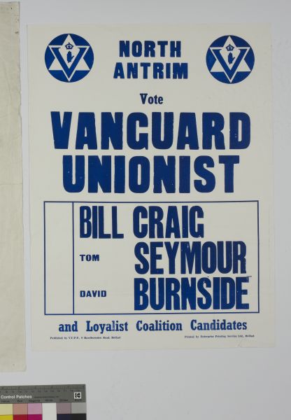 - Vanguard Unionist election poster for the June 1973 Northern Ireland Assembly election. Printed blue on white with Vanguard logos in top corners. 'North Antrim, Vote Vanguard Unionist, Craig, Seymour, Burnside.' Of the three Vanguard leaders standing in North Antrim only party leader Bill Craig was elected.