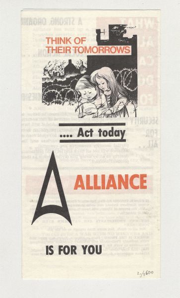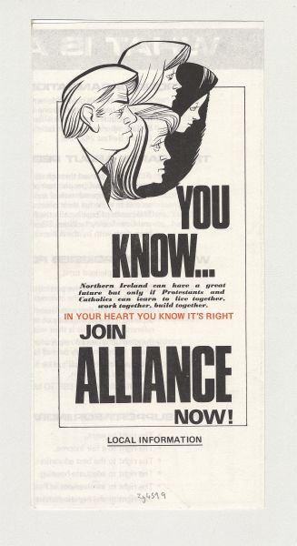 - Leaflet published by the Alliance Party, A Divided Community? or Alliance.You Know Northern Ireland can have a great future but only if Protestants and Catholics can learn to live together, work together, build together. In your heart you know it's right JOIN ALLIANCE NOW! An early recruiting leaflet from Alliance. The Alliance Party of Northern Ireland, often referred to as Alliance, was formed in April 1970. From the outset it drew its support from across the religious divide and from those primarily seeking reform within Northern Ireland and an improvement in community relations. Although its base of support was biased towards the middle class it initially also gained the support of many former Northern Ireland Labour Party voters.