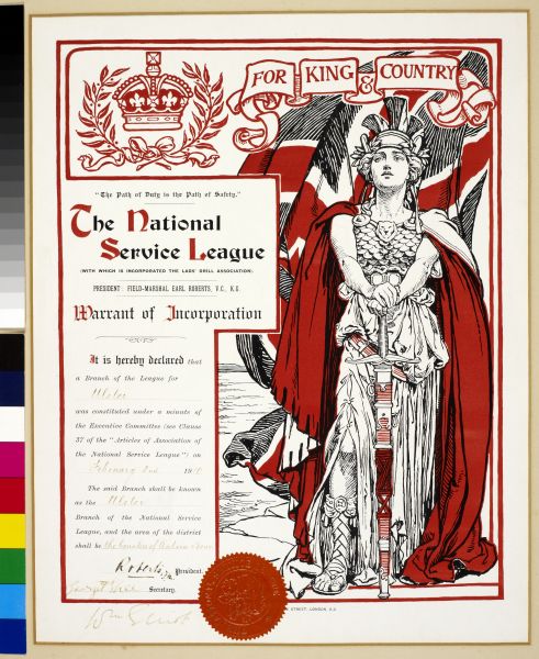 - National Service League, to right Germanic female in armour leaning on sword in red cloak with union flag behind :Ulster Branch for the Counties of Antrim and Down, dated 1910-02-02.