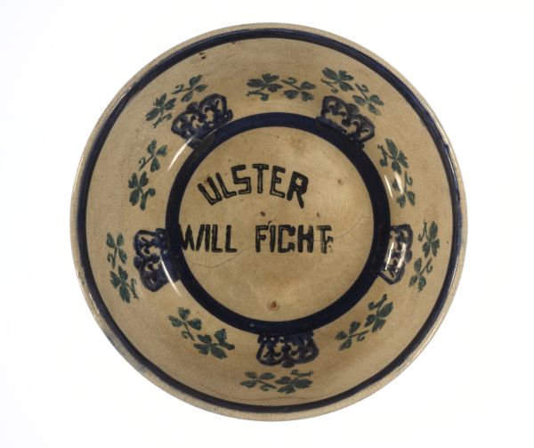 - stencil, blue, black and green. Cream ground. Base "Ulster will fight". 5 blue crowns with green shamrocks.