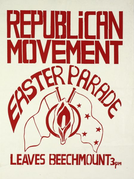- Poster issued by Republican movement. Printed red on white. 'Republican Movement, Easter Parade Leaves Beechmount 3pm.'