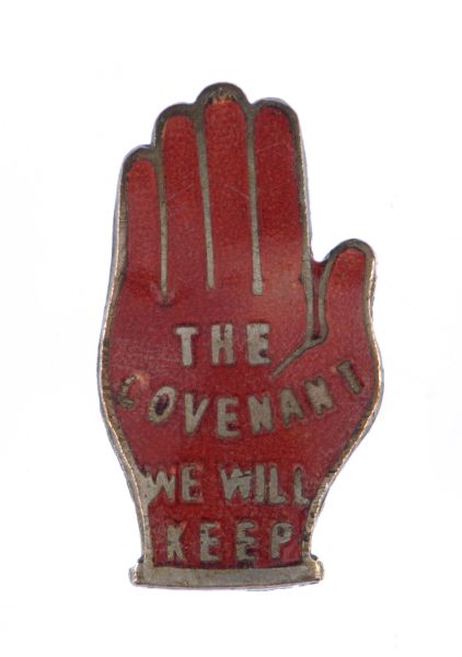 - A red hand on which in gilt 'The Covenant we will Keep.' Round stud for fastening.