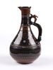 - Jug of lead-glaze red stoneware with a moulded handle and inlaid and applied decoration in blacks and creams. Bulbous body, bottle shape with a tall neck and a small pouring lip. Handle in the form of a bearded dragon. Decorated with geometric patterning based on plant forms in black, blue, white and buff. Four rings of beading.