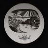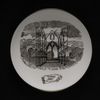 - Round plate made of glazed ceramic with a silhouetted depiction of Stonehenge, transfer printed, white plate with grey and black design with gold edging
