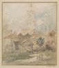 - Pencil and wash image of Hackney church tower peering over the surrounding buildings, with figures in the foreground.