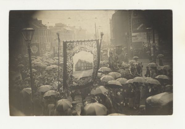 - Photographic postcard showing an Orange Parade in the rain with street lined with people under umbrellas and temperance banner carried in the foreground.