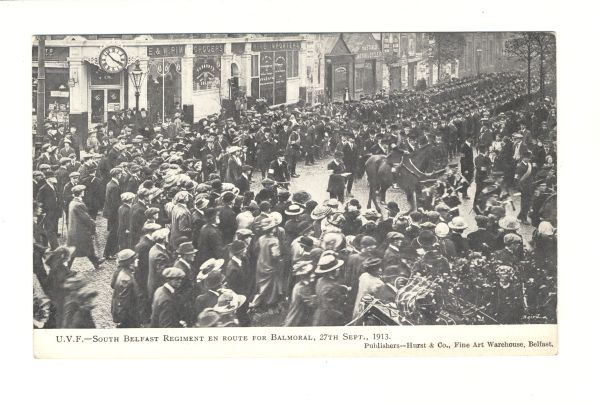 - Photographic postcard showing 'UVF South Belfast Regiment enroute for Balmoral, 27th September 1913.'