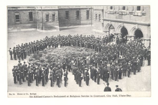 - Photographic postcard showing 'Sir Edward Carson's Bodyguard at Religious Service in Courtyard, City Hall, Ulster Day.'