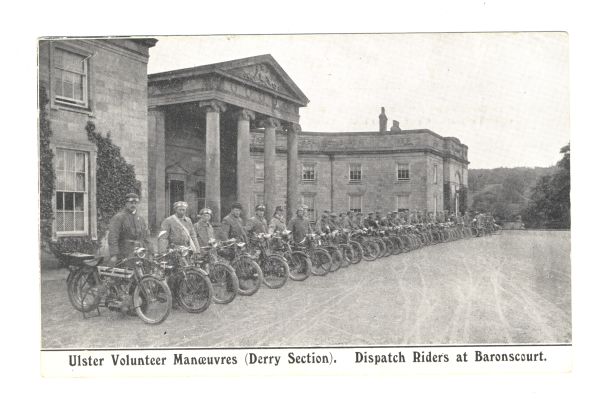 - Photographic postcard showing 'Ulster Volunteers Manoeuvres, Derry Section,' depicting motorcycle dispatch riders at Baronscourt, Co. Tyrone.