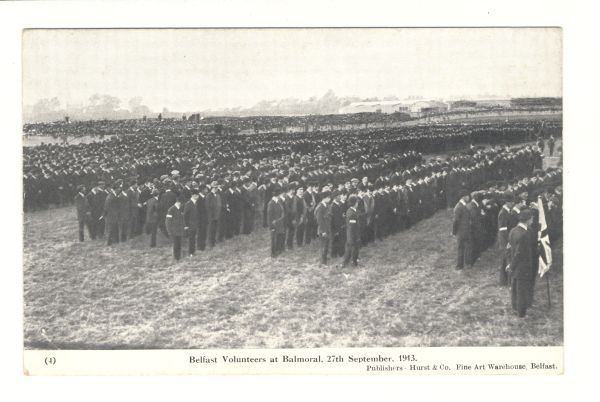 - Photographic postcard showing an image of 'Belfast Volunteers at Balmoral 1913.'
