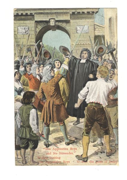 - Coloured graphic postcard featuring 'Apprentice Boys of Derry,' entitled 'Walker inciting the Apprentice Boys to shut the gates of Derry'; from the 'No Surrender' Series.